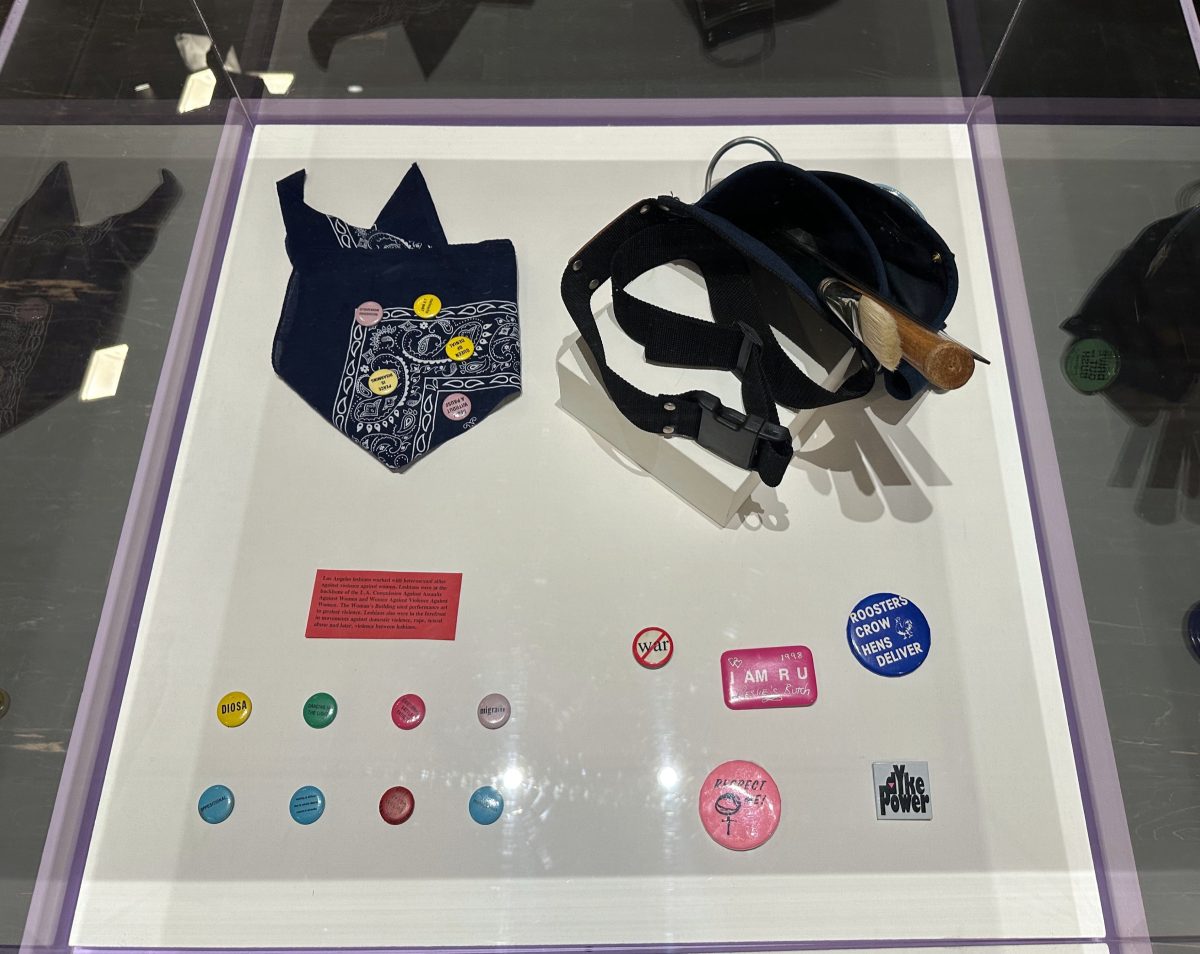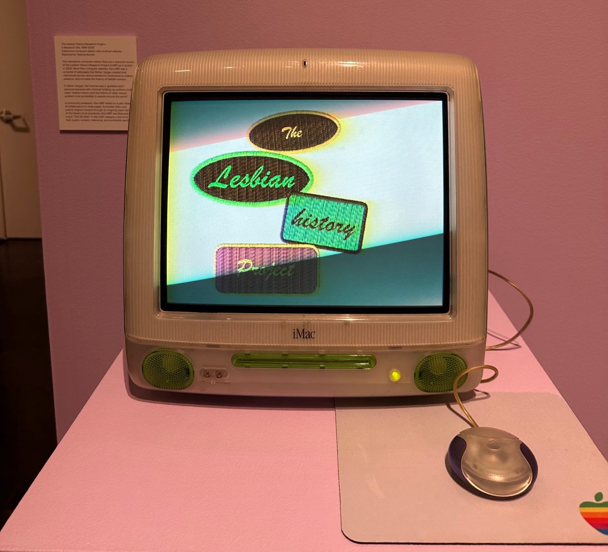 Co-curators Vanessa Esparza Quintero and Jocelyne Sanchez’s careful handling of these remarkable archives weaves intricate narratives that both sprout from and culminate in Retter Vargas’s ardent compassion for her kin. A restoration of the herstorian’s Lesbian History Project, a community bibliographic research repository, for instance, is browsable on an antiquated iMac. And if her words, voice, and technological archive were somehow not enough to convey the depth of her compassion, there is also an altar to her consisting of a bandana, pins, and tool belt that she regularly wore during her shifts as a librarian. Such presence and visibility cannot be overstated in a time of persistent crisis. As the curators and activists in the exhibition make clear, only we have the power to advocate and organize for ourselves, especially in the face of those who refuse to accept our existence.