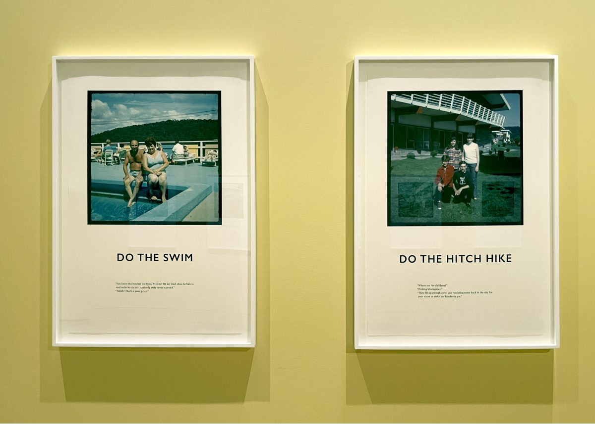 In the photo series Dirty Dancing (2017), which makes up the majority of the exhibition, Futernick blows up old slice-of-life photos, like her then-teenage uncles posing on a diving board, and her grandmother looking up from her Mah Jongg quartet. In “Do the Twist,” just below a photo of a man mid-dive, floating above unbroken water, are two lines of dialogue on a simple white background: “‘The fish is dry.’ ‘But they give a good portion. I like a nice portion.’” There are no attributions to the text, but one imagines they come from two women sitting on a white bench in the background. The simple exchange taps into the highs and lows of budget-conscious travel, of a class that could afford a vacation, but not luxury.