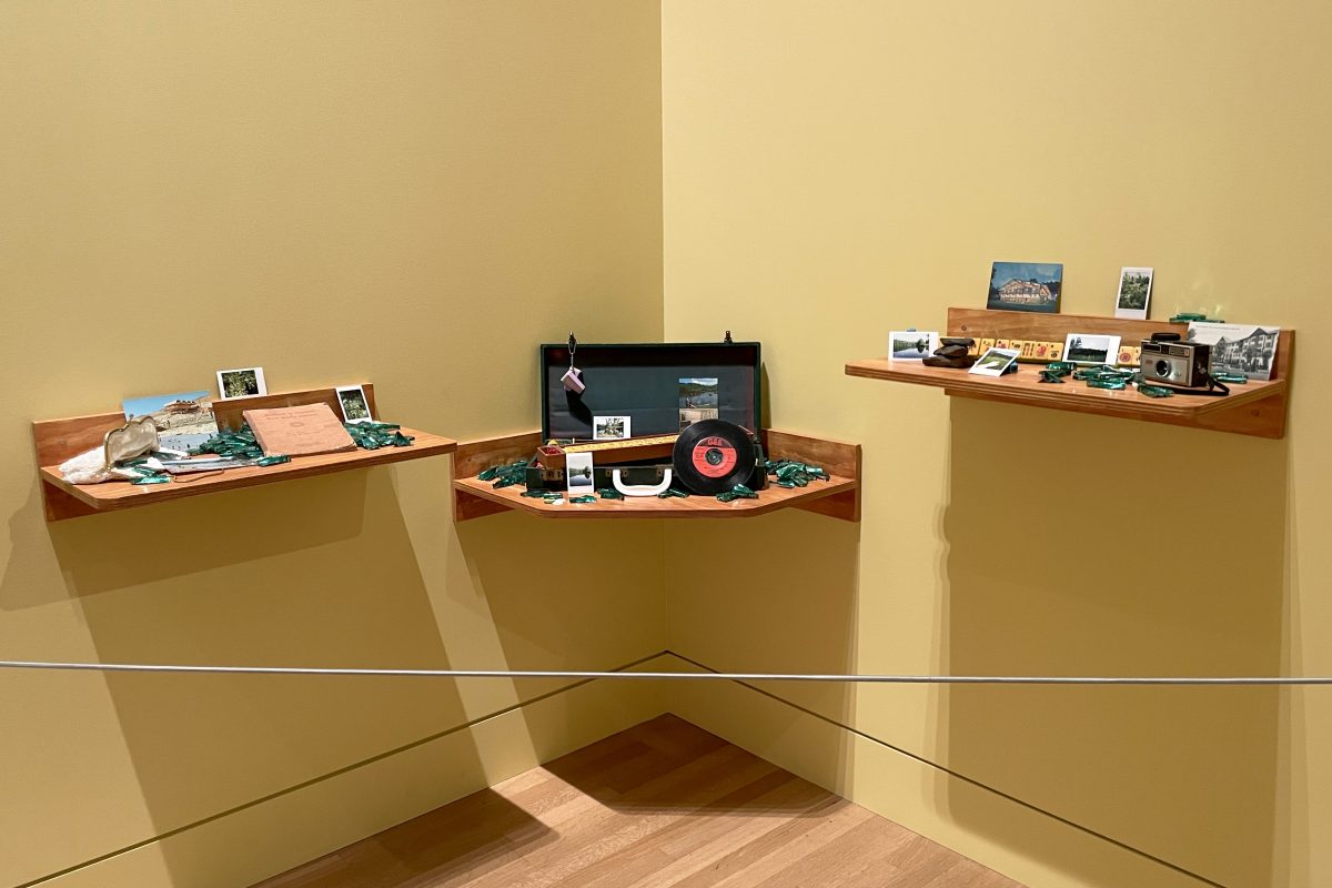 The Mah Jongg set also reappears in the installation “Bam, Crack, Rock, Pop” (2025), an arrangement of keepsakes on three floating shelves. Near it lies a small, pearl-beaded handbag, from which Andes mints spill out. The green-foiled candies were also a large part of my childhood, and I had never considered them canonically Jewish until now. But it should’ve been no surprise, because my own grandmother, who also spends her days kvetching over Mah Jongg with her sisters, seems like a carbon copy of Futernick’s bubbie.