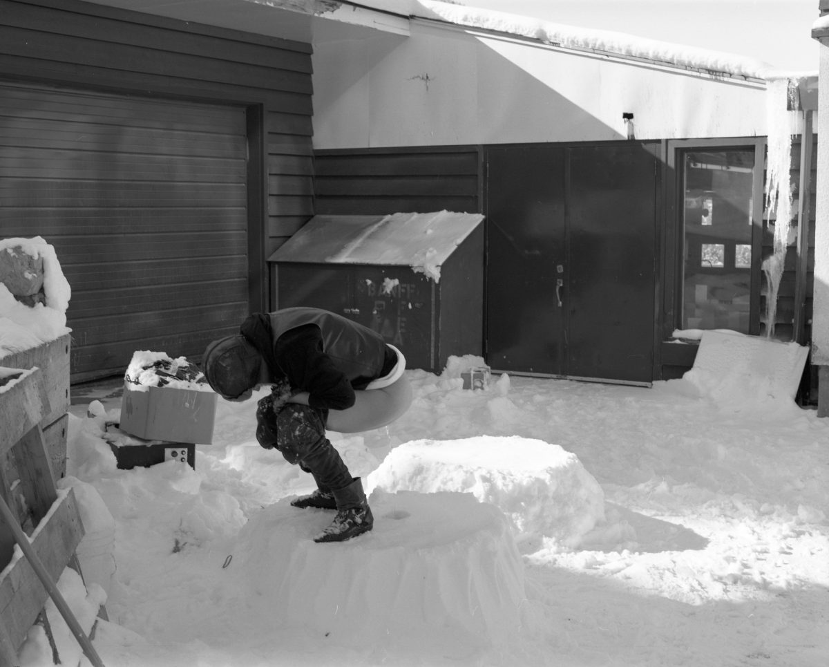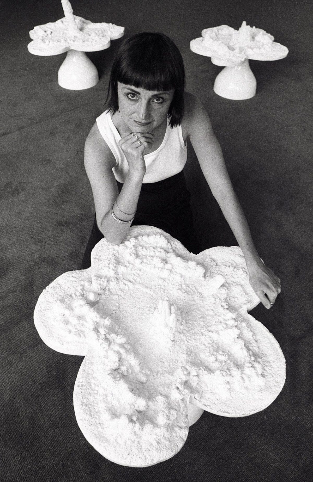 Smith’s essay traces the evolution of Chadwick’s practice, beginning with student exhibitions at Brighton Polytechnic and her 1977 master’s thesis show, In The Kitchen — in which Chadwick and several female classmates performed in the nude, covered partially by handmade sculptures resembling kitchen appliances. She chronicles Chadwick’s first major solo exhibition, Of Mutability at the Institute of Contemporary Arts in London in 1986 and what is arguably her most famous work: “Piss Flowers” (1991–92), painted bronze sculptures cast from the mounds of compacted snow onto which Chadwick and her husband, David Notarius, had urinated.