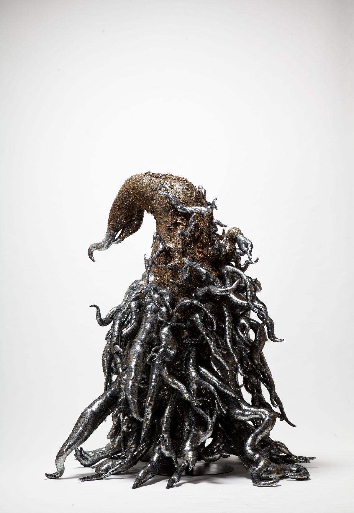 We turn and are then confronted by Lee Bul’s larger-than-life, shining, encrusted sculpture-cum-creature. “Monster: Black” (1998/2011) (as if the color itself were its name), part of a larger series, appears grotesque, asymmetrical, blobby, full of flesh-like limbs, tendrils, and exposed organs that are explosively congealed, yet also morphing. Crafted from materials often used for women’s ornaments, including metal, silicone, resin, chains, crystal beads, and organic matter, Lee’s monster dramatizes the complicity between the organic and the inorganic, between art and waste. It, too, straddles the ambivalence between life and nonlife: Its tendrils are hardened, yet also suggestive of growth, fullness, animacy, a bursting out of life, a fermentation that is also an arrest.