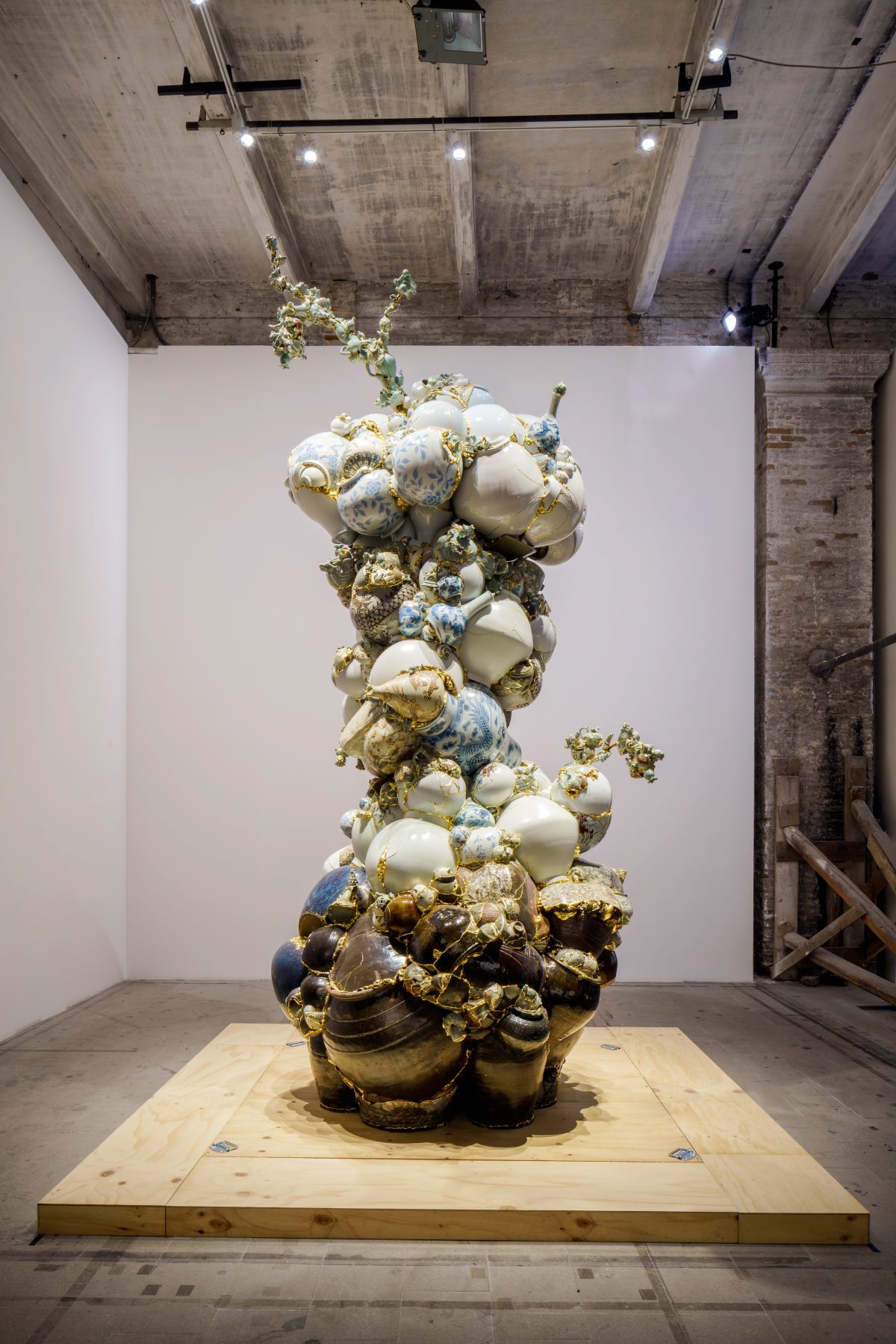 Chang’s intention, after the end of the exhibition, is to sink the sculpture into the Pacific, at the site of a former Chinese community on the California coast that was burned out by a White riot in the 19th century at the height of anti-Asian sentiment. Here is an art that refuses to be hoarded as treasure. This is a different kind of shipwreck — an intentional one, but one that also invokes the centuries-long entanglement between Western desire and Asiatic “goods,” both material and corporeal, from ceramic to spices to human labor. Chang’s ceramic memorial, though, aims to transform waste into birth, as it is meant, once sunken, to become a substrate for coral growth, to breed new, inhuman life.