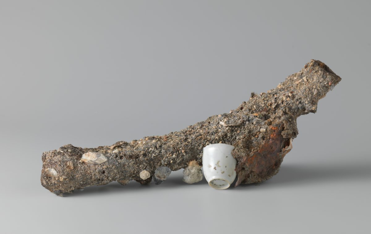Consider this 17th-century artifact, labeled “Porcelain and Pepper.” It is a stranded piece of a ship, probably iron, recovered in 1976 from the bottom of the ocean. It was part of the shipwreck of the Witte Leeuw, or White Lion, a three-masted ship owned by the Dutch East India Company that was carrying 400 kilograms (~881 lb) of porcelain, one of the most sought-after treasures of the time, and a cargo of spices, probably even more precious then. Pieces of china and peppercorn have embedded themselves into the fragment over time, even as marine life and organisms made homes out of this otherworldly remnant. This broken “branch,” this “monstrous body born from the greed for the artificial white substance that would feed European trade for centuries,” as Moon puts it in her catalog essay, offers us a fragment of a rooting genealogy and a repository of both imperial history and its wreckage.