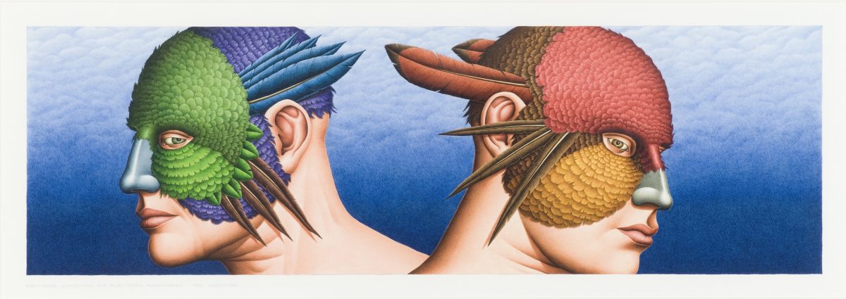 Countless spirits, traditions, memories, and truths are alive in the air between the works in Thus masked, the world has a language. Each of the nine pieces in the exhibition engages in layered dialogue with African diasporic mask and masquerade traditions, ranging from Afro-Mexican rituals to hand-carved Guro masks. Collage and assemblage are frequent techniques. Artists Raphaël Barontini, Nick Cave, and Tavares Strachan draw from archives, symbology, and texture to stitch together past and present. The tension between concealment and visibility between these layers and behind these masks is potent, creating room for embodiment, transformation, and imagination.