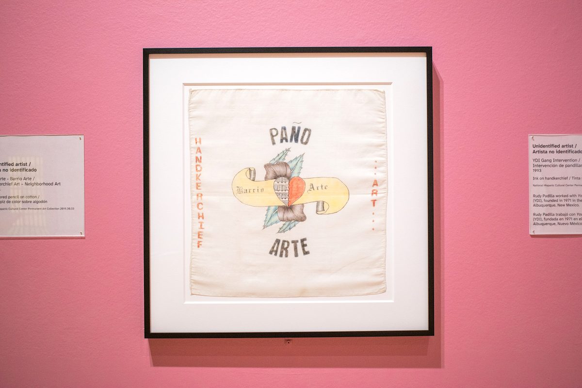 Into the Hourglass presents an incredible collection of paños — intricate pen or pencil drawings completed on handkerchiefs, pillowcases, and sheets — and paño-inspired art. Originally created by incarcerated Chicanos, paños are a testament to the innovative ways these artists cultivate creative lives and craft visual languages that reflect their cultural heritage, religious traditions, and lived realities. Paños are also a somber reminder of the harm caused by incarceration. Art becomes a means of survival under these conditions. Accompanying the detailed paños, a quote from an unidentified incarcerated artist reads: “You are inspired to do art that can transcend the feeling of the heart and soul.”