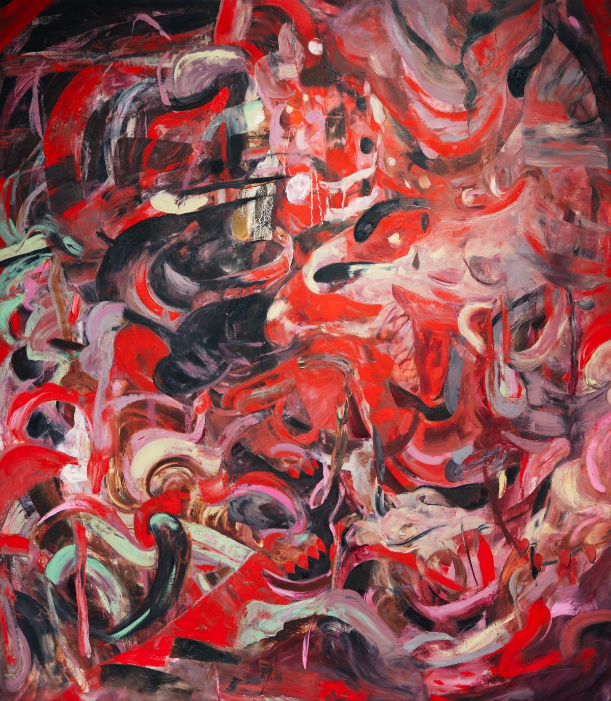 In the opening lines of the Iliad, Homer invokes the feminine with the words “Rage—Goddess, sing the rage,” and thus begins his thundering epic. Infused with a sense of Homerian rage, What She Builds, She Must Destroy at Distortion Society highlights a series of robust crimson-hued paintings by gallery director Michelle Silver. This solo show of her recent work wrangles concepts of motherhood, feminine power, and pleasure as reflected in these muscular works that seem to battle with themselves. With “The Unraveling” (2025) as a prime example, a swirl of fiery red gestures harmonizes in a metaphorical ecstatic dance, each painterly rhythm morphing into the next. In “Holding Pattern” (2025), we see the painter herself — pregnant, leaning forward, and returning our gaze — immersed in quasi-Impressionist environs, while “The Dancer” (2024) throws us further into a beautifully chaotic disarray of pure abstract frenzy.