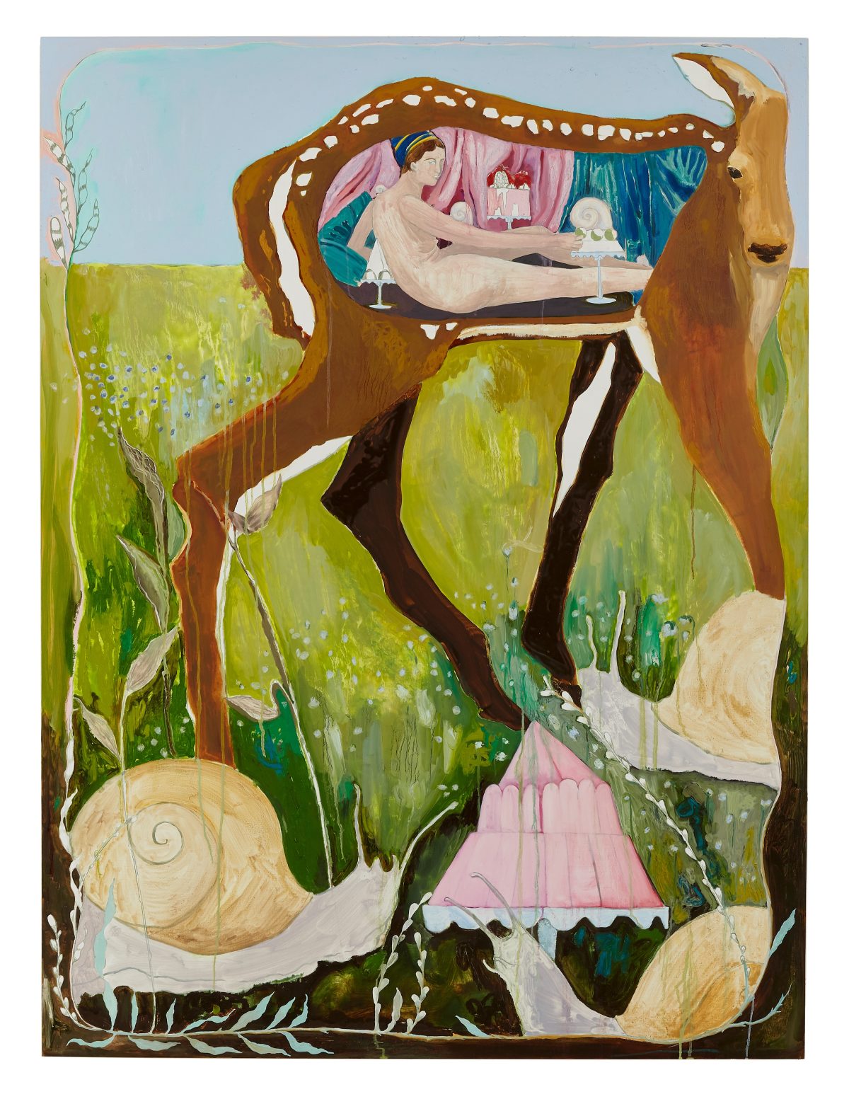 Inspired by myths and muses of history and employing the Sphinx as her symbolic focus, Dana Sherwood’s exploration of classic iconography is pure rapture. With recent paintings and glazed porcelain works, her solo show pays homage to eminent figures, including Persephone and Alice in Wonderland, among other literary heroines. “Moons of Medusa” (2025) is a luscious re-imagining of the wrathful gorgon in glowing porcelain. With “Inside the Belly of the Fawn (odalisque)” (2025), we encounter a contemporary version of Ingres’s famous sitter, this time surrounded by sweet treats and lovingly nestled beside a fawn who steps carefully among snails in a pastoral environment. “Inside the Belly of the Horse (lagoon with pomegranates)” (2025) continues the theme of femme beauty in a rarified world, where one woman straddles a horse and another rests inside its body while the entire poetic landscape is lush with fruits, cakes, pomegranates, and lovely white birch trees.