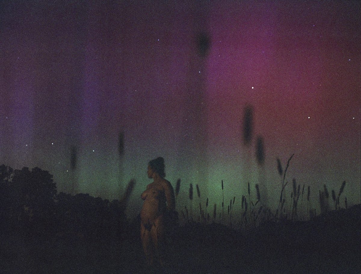Documenting her life as a mother and a farmer, Olivia Bee uses photography to capture moments of human bliss and the poetic transience of the natural world. Her solo show In the Secret Distance centers recent photographs that radiate with otherworldly sensitivity and ease. The artist currently stewards 60 acres of farmland with her husband and daughter in the Umpqua Valley of Western Oregon, a place that features prominently in her work. In “Northern Lights” (2024), a naked woman turns her head toward a blazing pink and purple night sky, while in “Fescue in May” (2023), a woman stands in an expansive field as she faces the brilliance of a rising sun. “White Rainbow” (2023) captures the essence of Bee’s affinity for the land, portraying a chalky glowing arc over a pastoral landscape.