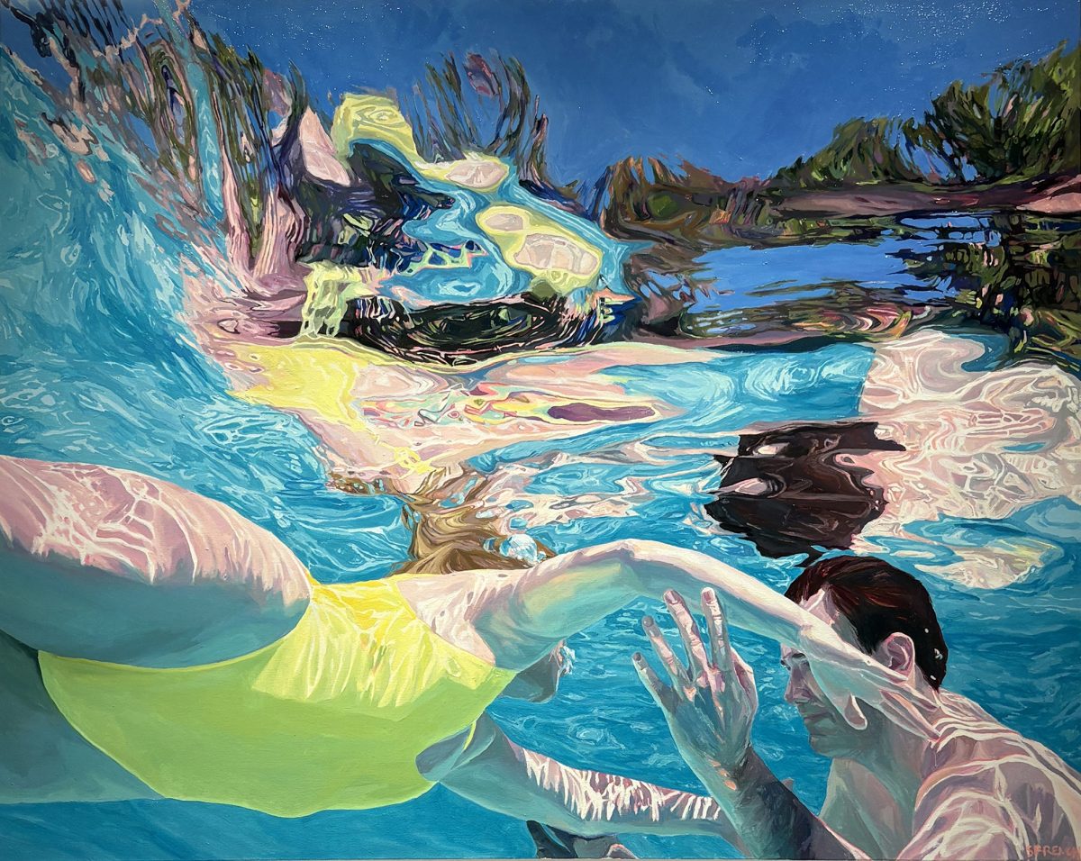 With a celebratory spirit as the baseline for this six-person exhibition, The Summer Show is a charming complement to the festive month of July. Several gorgeous, glistening paintings by Samantha French capture sanguine swimmers in brilliantly blue water, including “Summer Solstice” and “Bon Vivants” (both 2024). “Time Traveler Heat Wave” (2025) by Clark Derbes is a playful geometric-patterned sculpture made of polychrome sugar-maple, and Margaret G. Still’s “Green Gas Station” (2025) is a dreamy vision of what could be a pit stop on a summer road trip, while Andrea Moreau’s “Poland (Glider)” (2023) depicts a frosty landscape of white mountains, the utter antithesis of this steamy season.