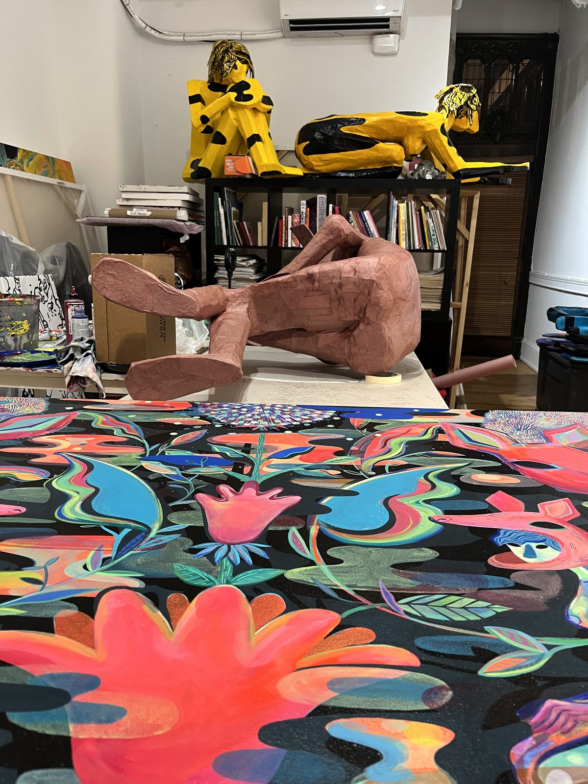 My studio is my favorite place, a space for freedom, experimentation, and getting lost in my work. I go whenever I can, though I don’t follow a set routine — maybe because routine feels at odds with what the space offers me. I usually have more than one project going on at once, and I alternate between drawing, painting, making sculptures, and planning new work. I love listening to audiobooks while working; I feel like I can be completely focused on both the narrative and my artwork, as if the two activities engage entirely different parts of my brain. However, even when I’m completely immersed in both, I know the narratives are seeping in. Some narratives leave visible traces and others dissolve into a mood. My favorite recent listen is Martyr!, a novel by Kaveh Akbar.