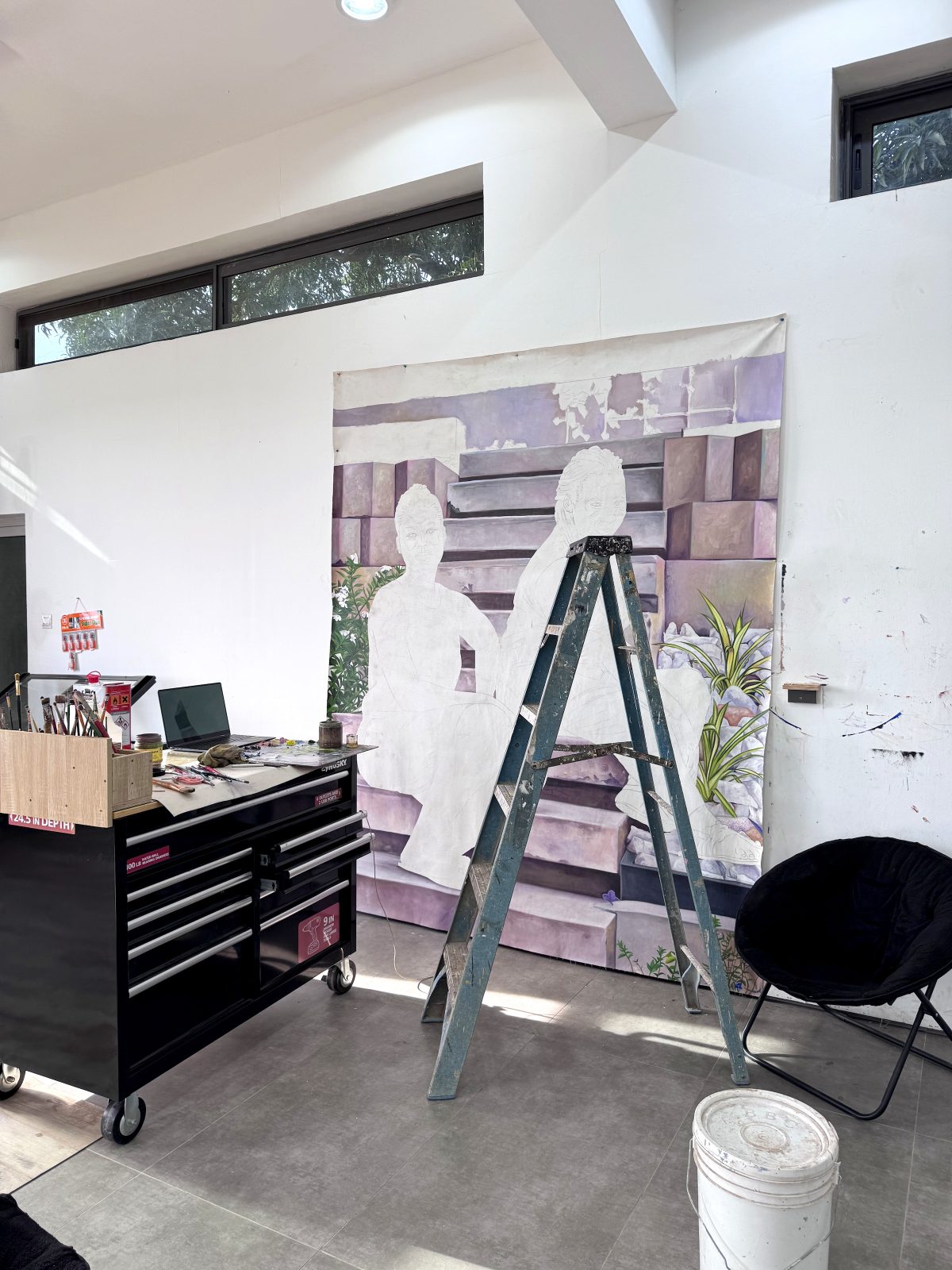 In the studio, my work involves collaging, cutting, erasing, gluing, moving pieces around, picking up paintings, hanging them, then putting them back on the table to collage some more. Working alone is manageable, but having an assistant makes this flow much easier and smoother. Music is non-negotiable. Without it, the studio feels flat. When I work with my assistant, everyone gets a turn as DJ.
