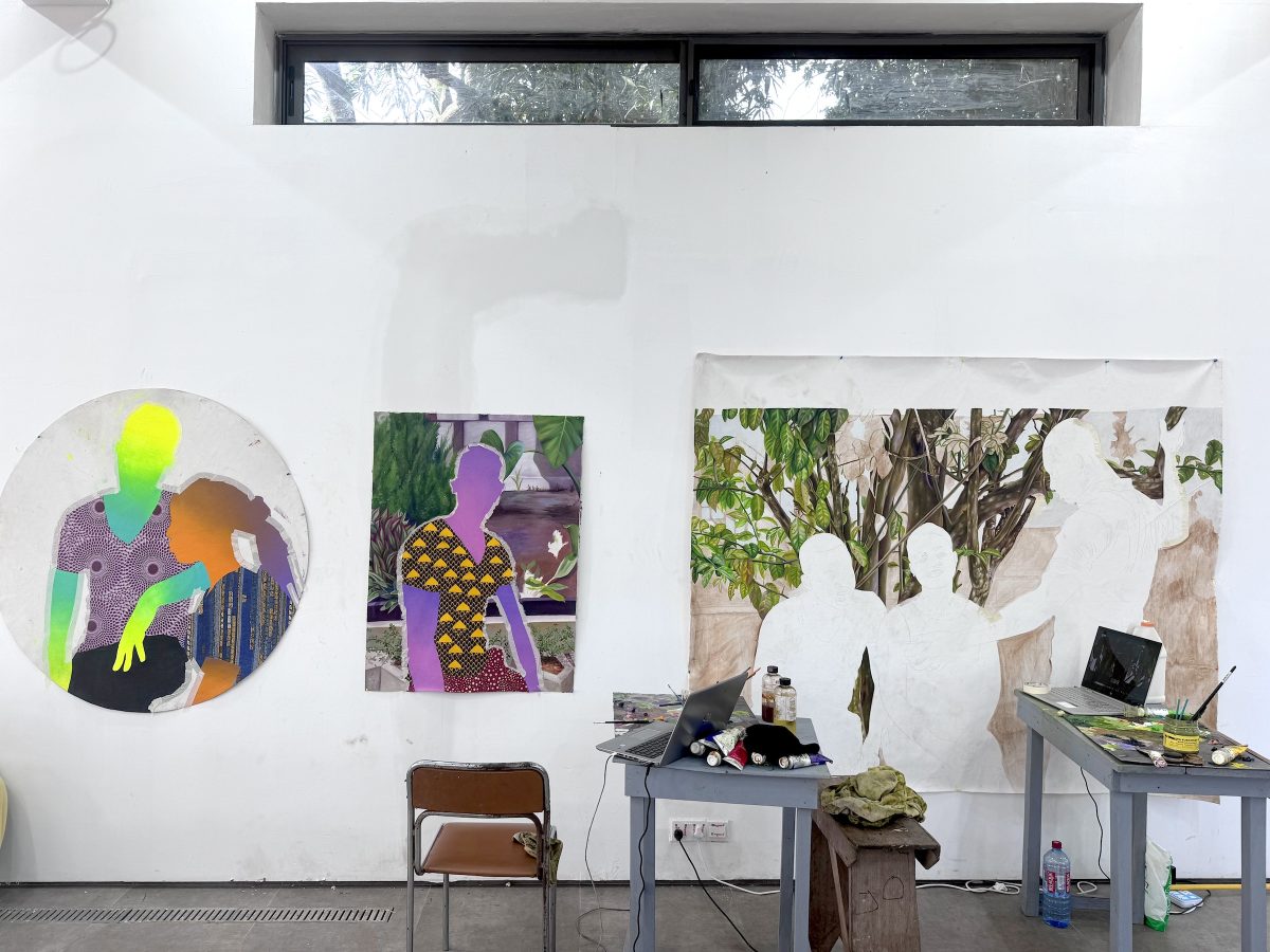 My studio situation spans both Ghana and the US, specifically New York. My main studio in Ghana allows me to work on ambitious projects. However, one challenge I face there is access to art materials. Many essential supplies I rely on — certain types of canvas, matte medium, pH-neutral glue, and quality oil paints — are not readily available in Ghana. To manage this, I periodically ship materials to Ghana to maintain my inventory. Whenever I plan a trip back, I stock up on the necessary supplies and tools beforehand. I have found a few art shops in Accra that carry some of these materials, but it’s still not enough to meet my needs. I often wish I could simply drive to a local art store and find everything I need on the shelf.