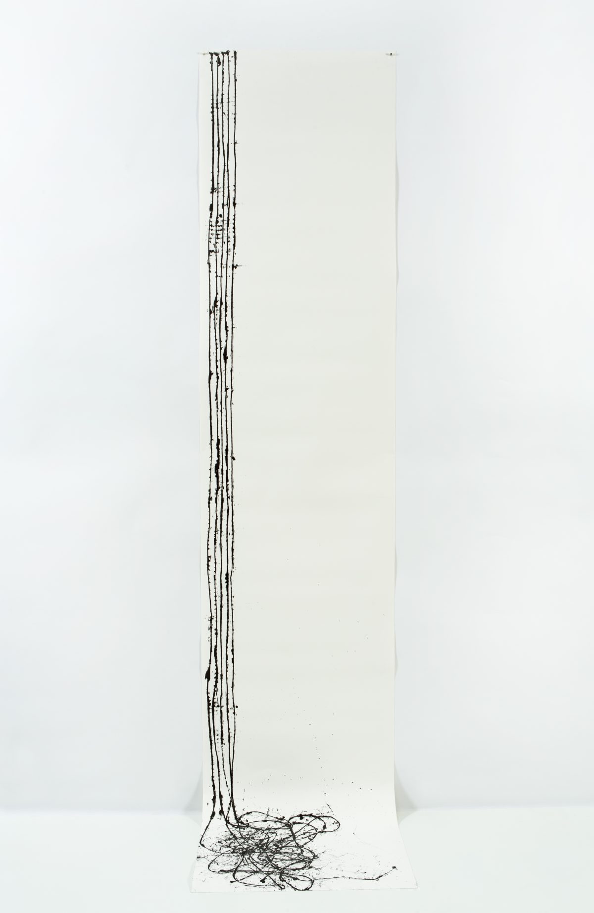 Lynne Tobin knows that the simple line is the ultimate muse. Her solo show is a celebration of the indomitable black line: going here, going there, going everywhere as guided by Tobin’s careful directions and discoveries. In “Threads #7” (2023), layers of them (one on top of the other) give the impression of woven fabric, while “Line Drama” (2018) is a long vertical drawing of five frantic black lines that start on the wall and run down to the floor in a beautiful and messy calligraphic jumble. In “Untitled” (2017), a meditative wave coming in from the right fades out into broken streaks of black stardust to the left.