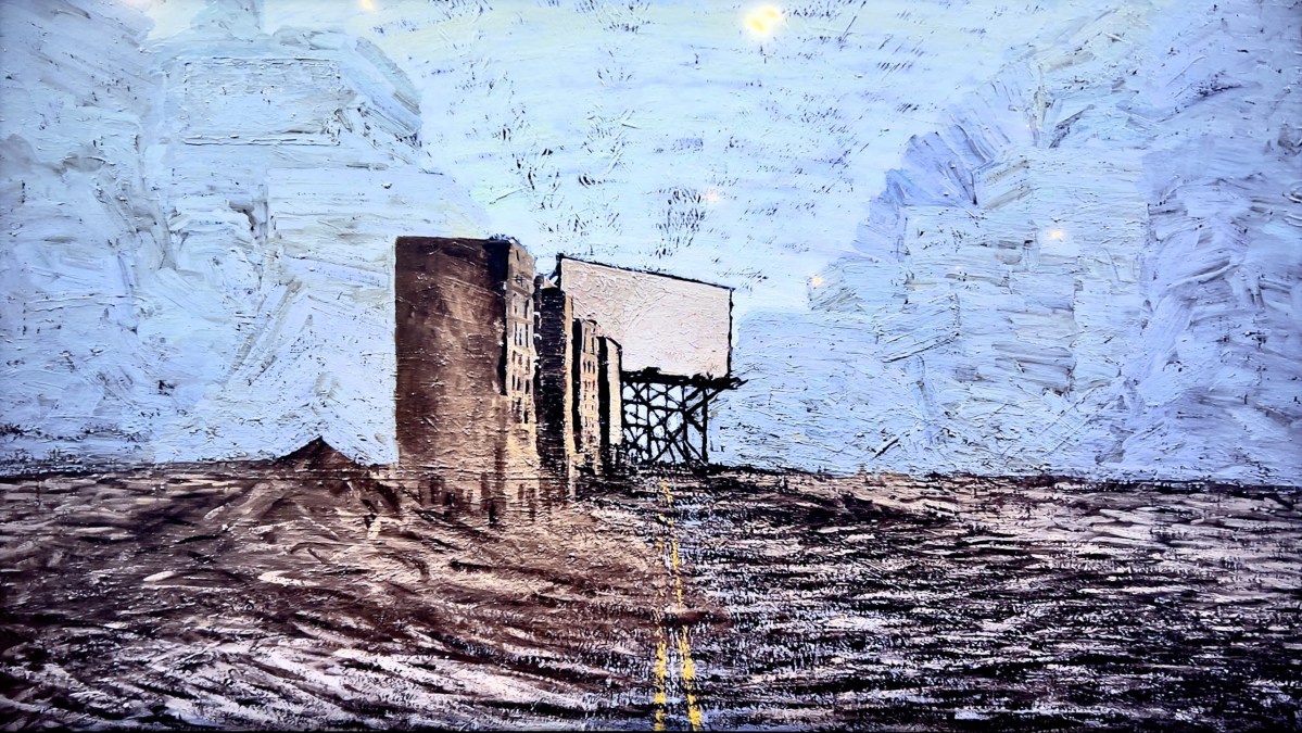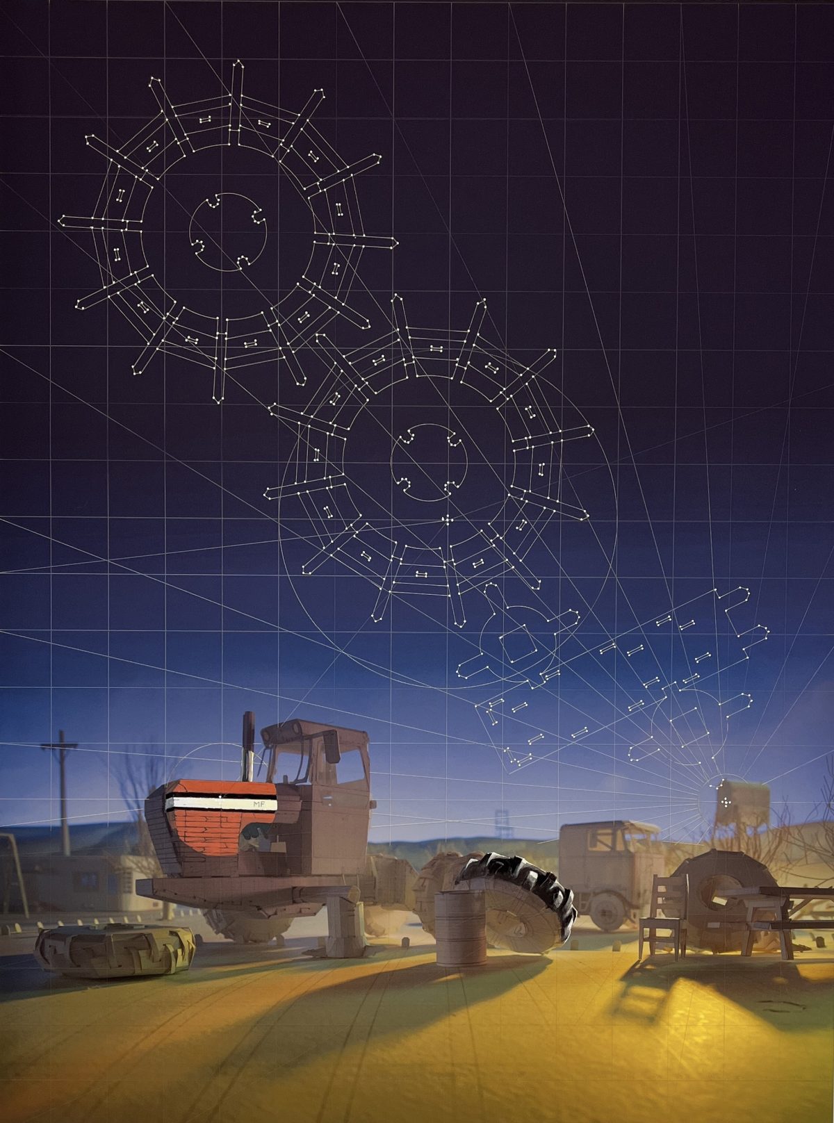 Among the most impressive exhibitions in Upstate New York this month is an exhibition by Ken Ragsdale, where the Twilight Zone meets theatrical movie set mock-ups in a mesmerizing suite of 12 elegant paintings. Each title begins with “Symphony #1” (all works 2025), and a mysterious story unfolds from there: In “Symphony #1 2nd Movement Evening ‘The Tractor Tire,’” we come upon a defunct tractor backlit against a cerulean night with thin white drawings of spinning gears occupying the sky. The other works follow a similar pattern: enigmatic worlds below with mathematical constellation-like drawings above. In “Symphony #1 1st Movement Afternoon ‘The Slide,’” a children’s playground full of empty slides appears to be at the threshold of another galaxy, while “Symphony #1 2nd Movement Morning ‘The Tent Trailer’” takes us into a trailer park environment but leaves us guessing as to where we are and what got us there.