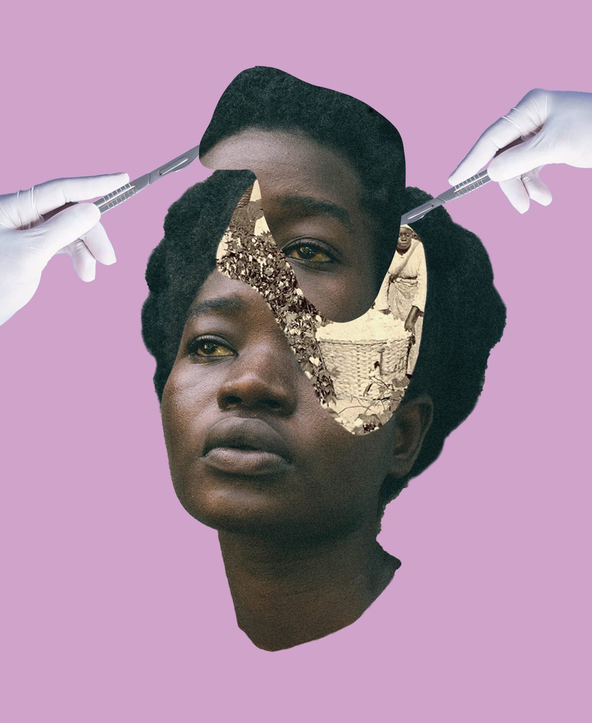 Exploring the rich intersection between beauty and Black identity, photographer Brandon Thomas Brown is a master at capturing human complexity with candor and care. Ancestry brings together recent works that employ collage techniques and portraiture to express depth of character while hinting at personal wounds. “Operation” (2024) features a younger woman’s face cut apart and dissected to reveal an older woman at work under her skin against a deep pink background, while “No Time for Black Tears” (2025) is a portrait of a pensive man who leans forward, the hazy blue-hued lighting revealing the scars on his face. Set against a similar indigo backdrop, “Untitled [Dakaibo]” (2025) features a bare-chested man turning away, his stoic pose suggesting an intimate moment of personal reckoning.