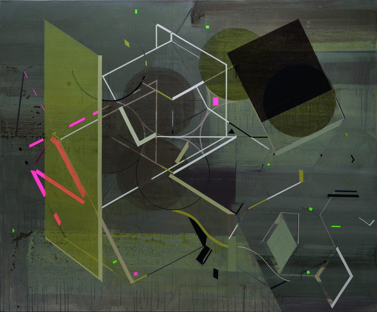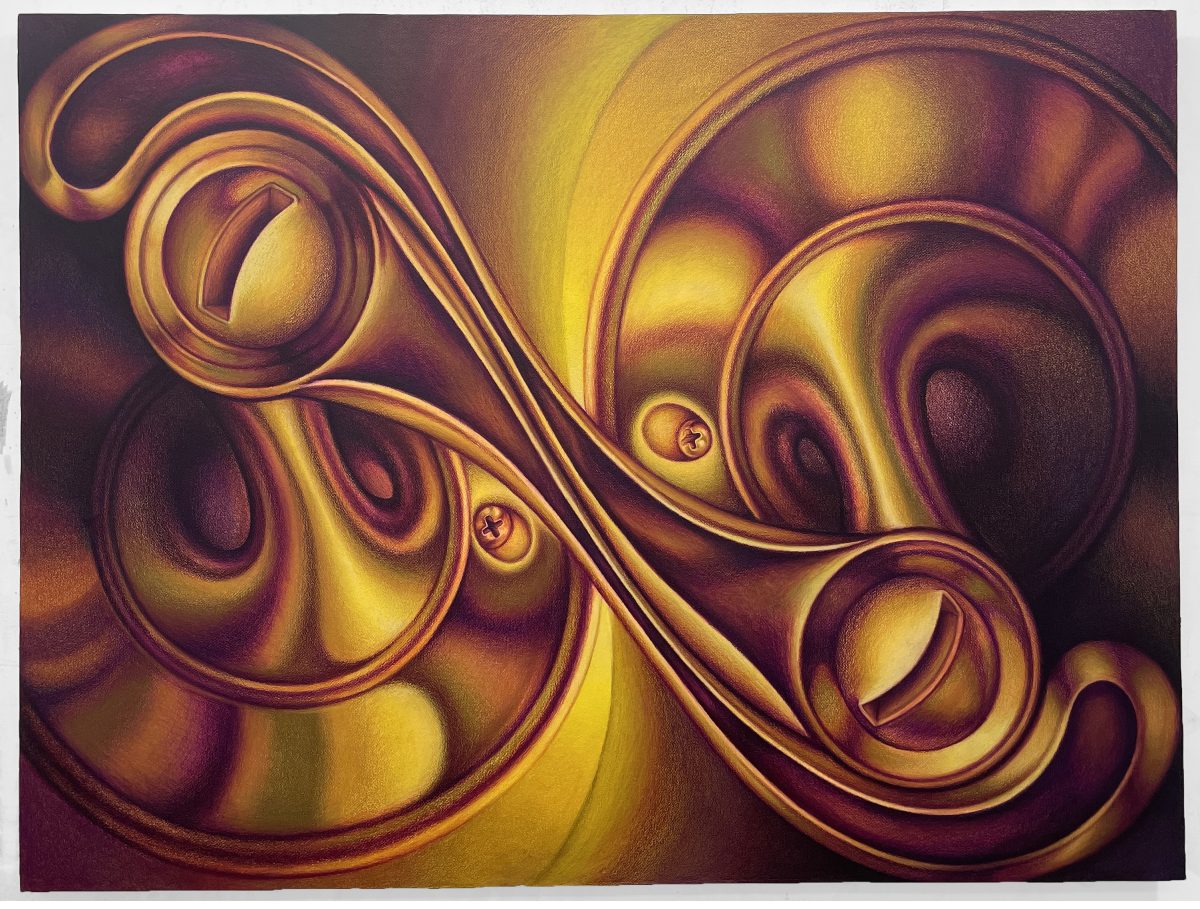 Turley Gallery typically presents at least two exhibitions at once, and this time around Adam Linn: Fascinator is one of three terrific shows (a visit there this month also gives you the chance to see magical glittery collaged works by Vickie Pierre and a theatrical site-specific installation by Sara Stern). Combining a graphic edge with a masterful command of colored pencil, gouache, and watercolor, Linn’s paintings feel like Pop-inspired industrial animation. “Fixations” (2025) is a vigorous yellow scene piqued by two opposing screwheads; meanwhile, one feels seduced by the sumptuous glowing pink machine of “Metalmouth” (2025), while the gears of “Rainbow Elixir” (2025) appear to melt into pure electrical magnificence.