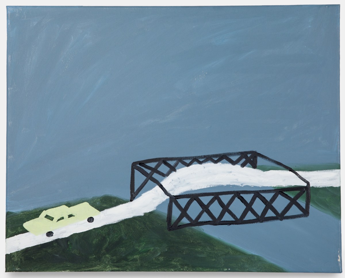 Taking inspiration from the diverse culture of his native Los Angeles and influential social moments such as the Watts Rebellion of 1965, a series of uprisings in response to violent confrontations between White law enforcement and Black civilians, Little Walt Dog (L.W.D.) paints with a brave spirit. His solo exhibition Crossing America features stark oil paintings (all works 2025) that offer barren and blunt visions of an empty United States occupied by lone cars. In “Crossing America #12,” a yellow vehicle approaches a black bridge against a bare background, while in “Crossing America #8,” two cars drift along a white road. In “Crossing America #15,” that same yellowish car from the overpass disappears into a bluish haze without a horizon as the headlights lead both the car and the road into a deserted mist.
