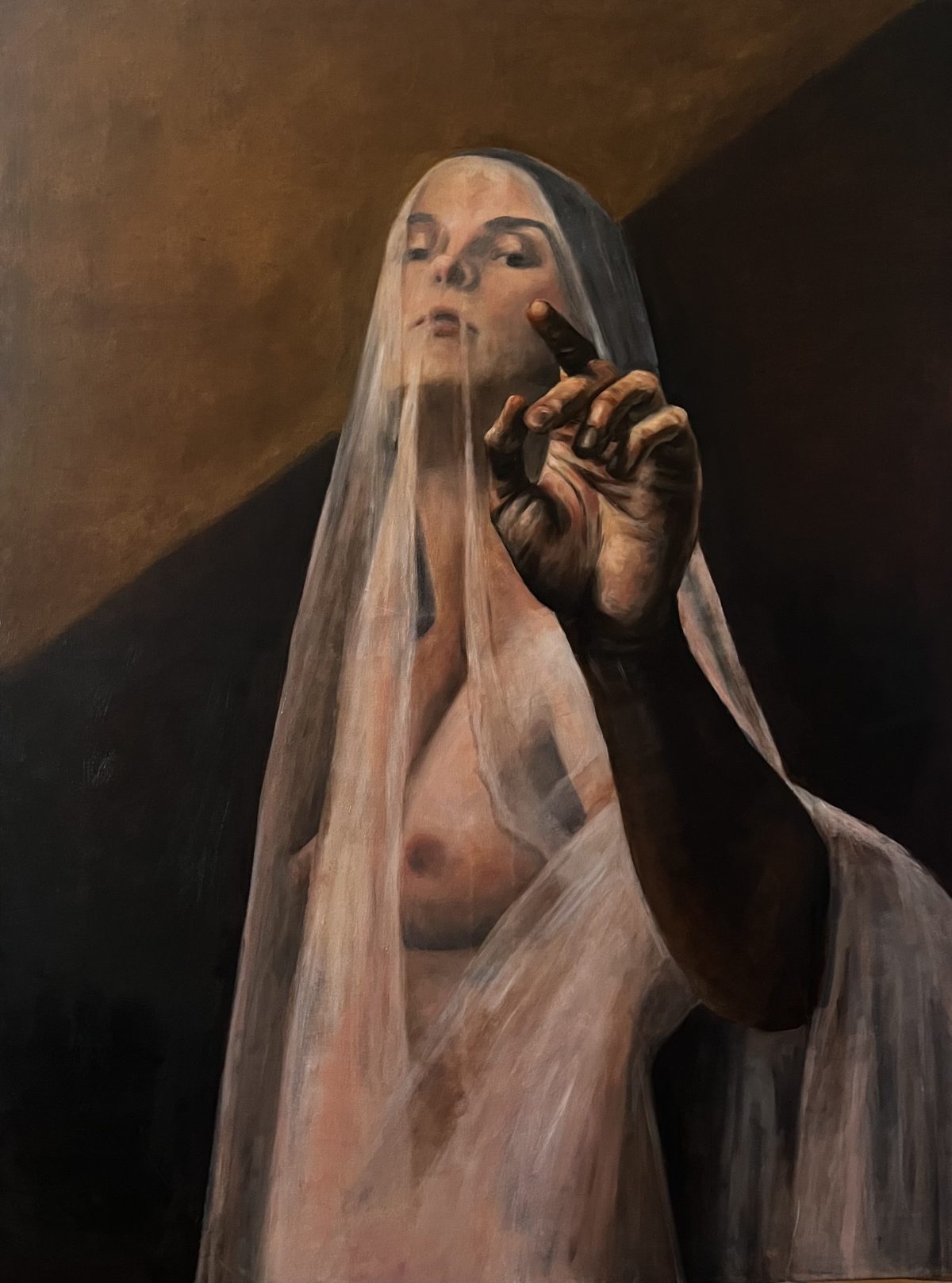 A female-run gallery and platform for underrepresented creatives, WomensWork.Art in Poughkeepsie presents the juried exhibition Invoke & Imbibe, featuring works by 26 female and non-binary artists active in the Hudson Valley and beyond as selected by guest curator Jaime Ransome. With a desire to celebrate “unapologetic female energy,” as stated in the press release, Maria Krasnopolsky’s “Veiled Emilia” (2024) depicts a naked woman covered in a ghostlike veil as her hand gestures toward us. “One Without Shame” (2023) by Lauren Hollick features yet another naked woman, this time in the fetal position, lying flat on a cozy bed of natural moss and little white mushrooms. Evelyn Gardiner’s “To Consume A Butterfly” (2024) is a sultry oil painting that includes Latin text; in it, two women attempt to eat glorious butterflies in a natural setting as they try to escape.