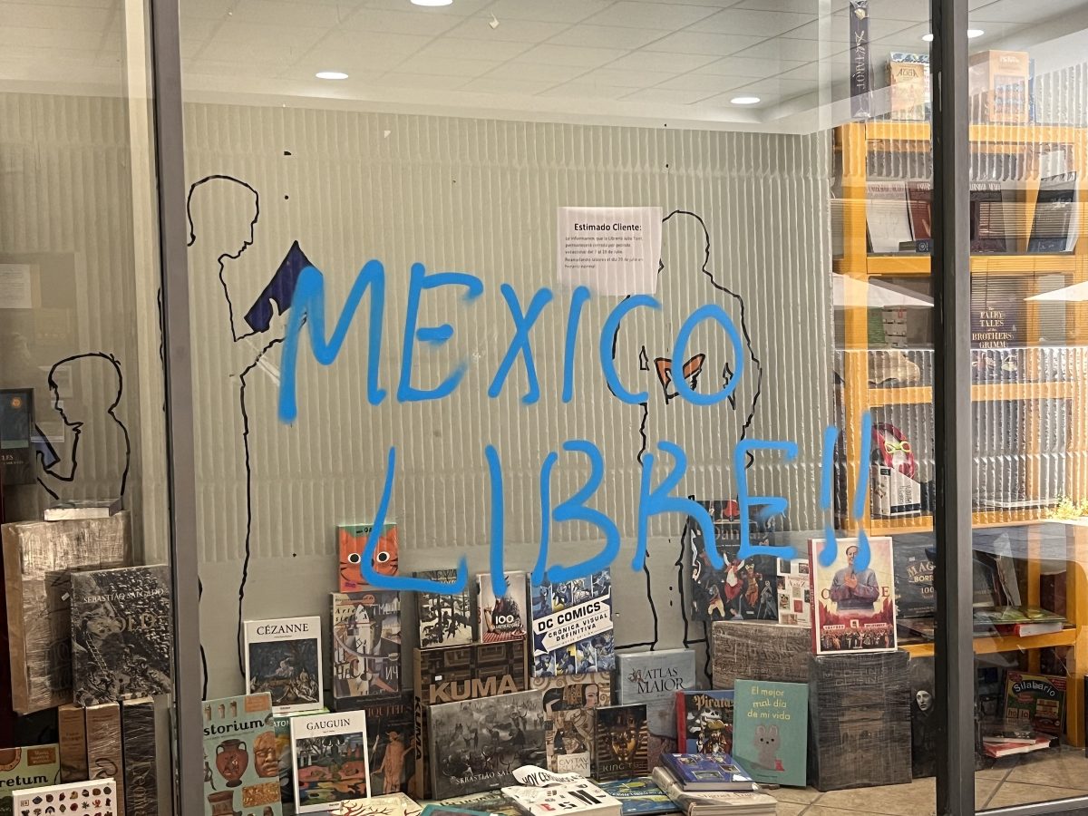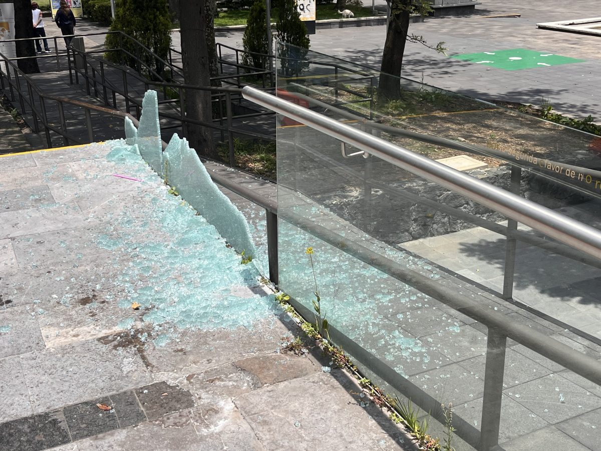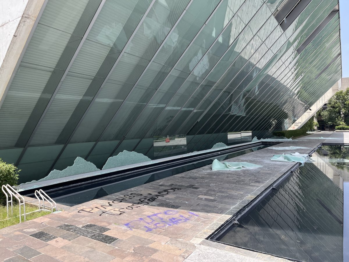Black bloc protesters graffitied and broke windows on the campus before arriving at the cultural center, which houses the Museo Universitario Arte Contemporáneo (MUAC), a concert hall, several theatres, and other facilities, including the Julio Torri Bookstore, which they broke into and ransacked. Protesters smashed the glass balustrade surrounding the museum’s angled façade and cracked half a dozen tempered glass panels, which dangled near a small pile of burning books on the esplanade while others graffitied Rufino Tamayo’s monumental outdoor sculpture “La Espiga” (1980). Protesters did not gain entry to the museum, and no other artworks sustained damage.