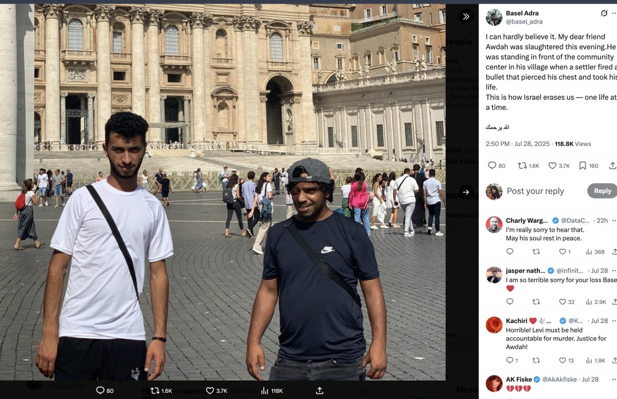 “I can hardly believe it,” co-director Adra, the film’s main subject, wrote on X. “My dear friend Awdah was slaughtered this evening. He was standing in front of the community center in his village when a settler fired a bullet that pierced his chest and took his life. This is how Israel erases us — one life at a time.”