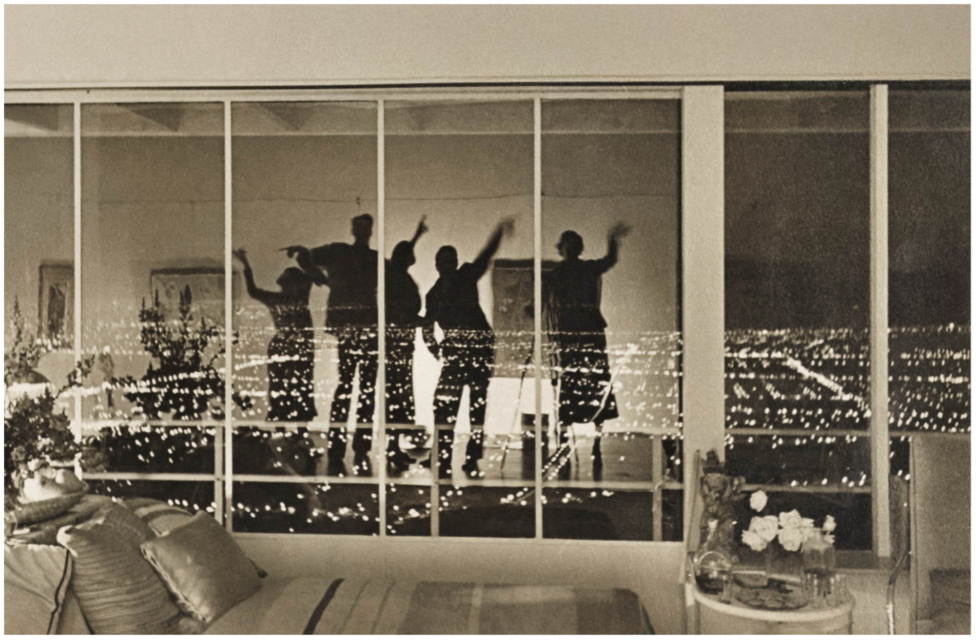 Community and celebration shine through a Marjorie Williams’s photograph recreating Angelica Archipenko’s 1934 image of revelers reflected in the house’s windows, the city lights fanning out behind their silhouettes. Williams’s version features Cortez, Byrne, fellow artist Fidencio Fifield-Perez, and Cortez’s UC Davis graduate students during a recent communal meal.