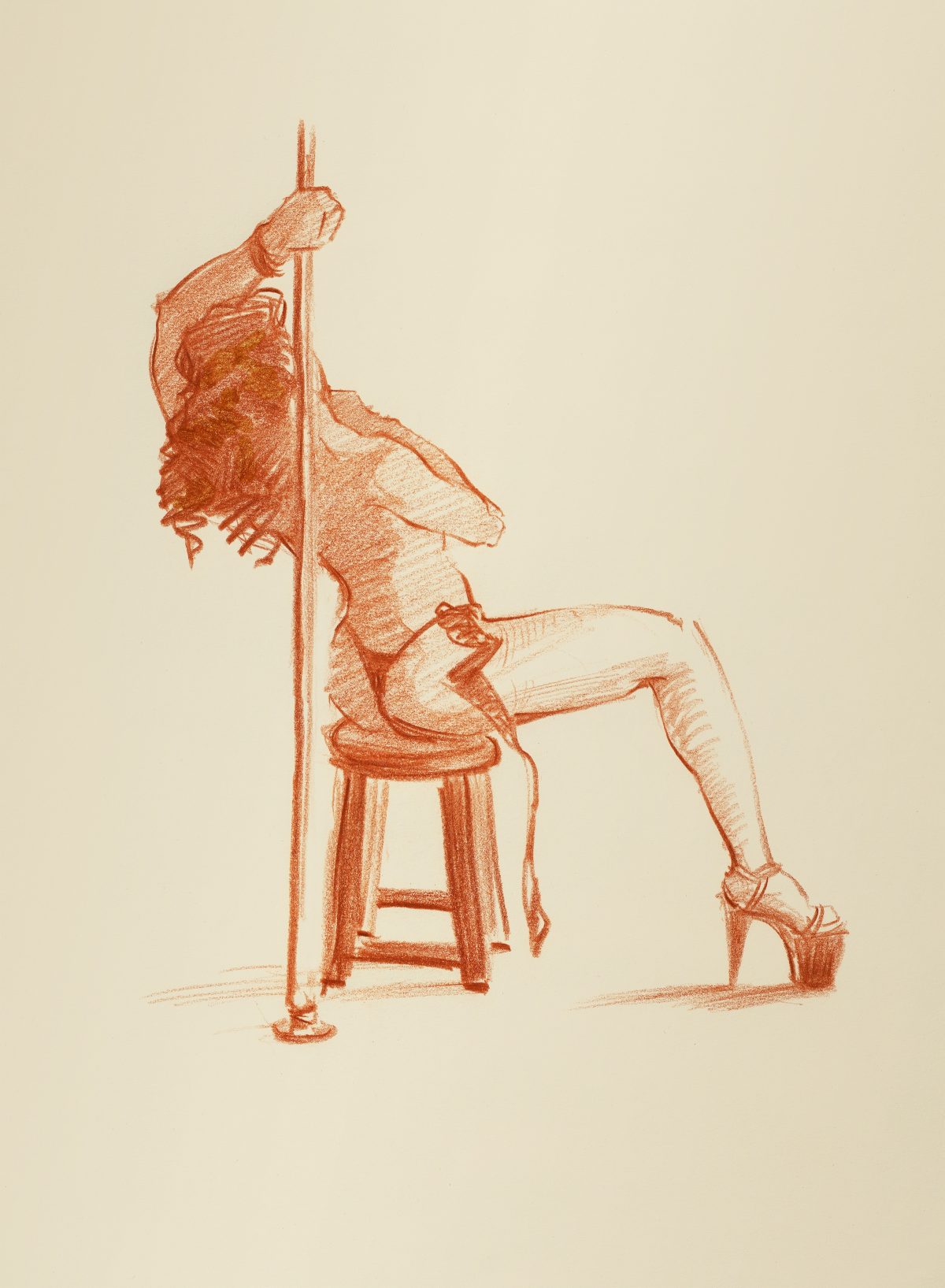 In 2012, while working as a stripper in East London, Clare decided to revisit stripper life drawing using a small room on the upper floor of the White Horse, an infamous, now-shuttered club in Hackney. One year later, the life drawing class had evolved into the East London Stripper Collective (ELSC), a sex worker-led organizing body that advocates for sex worker rights and hosts regular stripper life drawing sessions.