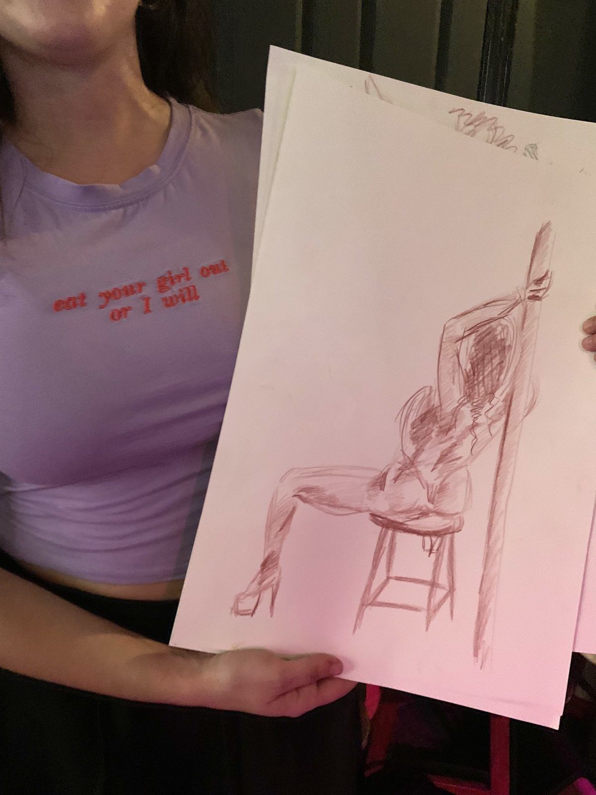 The ELSC — including Clare and her co-organizers, Samantha Sun, Maddie Sexxxy, Izzy Mac, and Glam Clam — defines stripper life drawing “as a natural progression from the age-old practice of hiring professional harlots and hussies as models for art.” The models for the ELSC drawing events are sex workers from London and elsewhere, including Sabrina Jade. The line between sex work and art is arbitrary and non-existent, they explain, and the attendees are both artists and consumers of sex work.