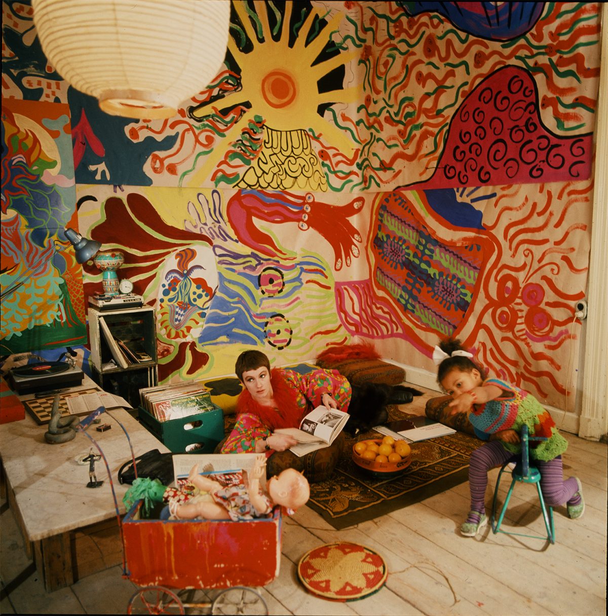 In addition to the fiber artworks, which were often used as staging or set pieces to backdrop performances, the FWM retrospective will present images of Moki and Don’s home life, replete with wildly painted walls, patterned floor cushions and rugs, and scenes of affectionate domestic chaos with their children, Neneh and Eagle Eye, both of whom went on to become musicians.