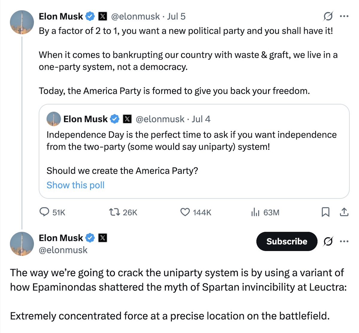 Musk’s allusion to Thebes might be a tacit jab at his rival, Steve Bannon, who frequently expresses his adoration for the Spartans and the Peloponnesian War. Thebes is well known for the Sacred Band, but it is also famous for being the power that finally toppled the Spartans. Following Musk’s announcement of a third party, Bannon took the bait and attacked Musk on the “War Room” podcast by calling him a buffoon and a mook. Whether the references to Thebes were an implicit jab at Bannon’s love of Sparta or not, Musk often engages in pseudo-intellectual but misguided flexes that cast him as a savant and erudite nerd. And yet the technocrat is well-known to misunderstand the meaning and context of the literature he claims to read.