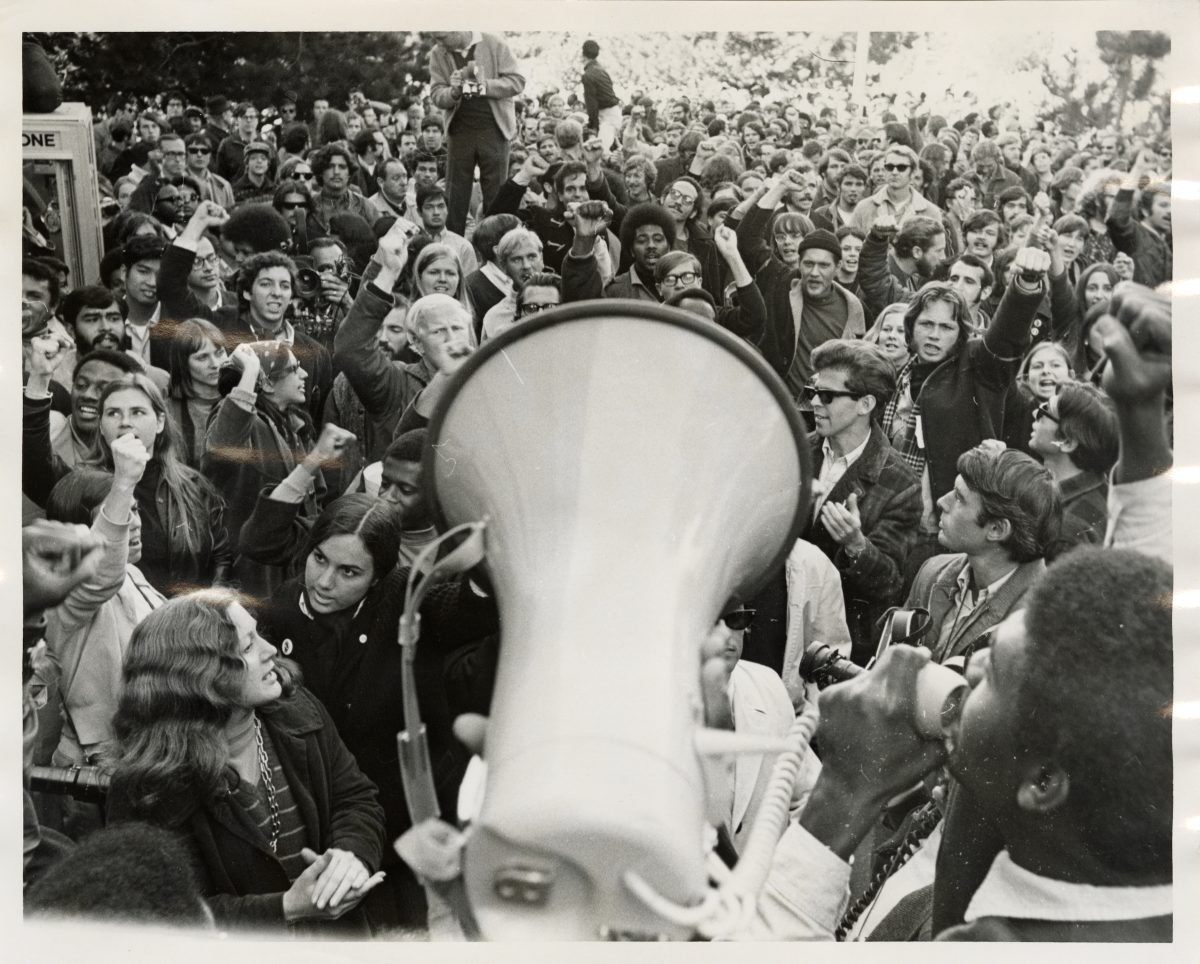Lonnie Wilson, “Illegal speaker near AD building” (1968), reproduction of gelatin silver print (courtesy the Oakland Museum of California)