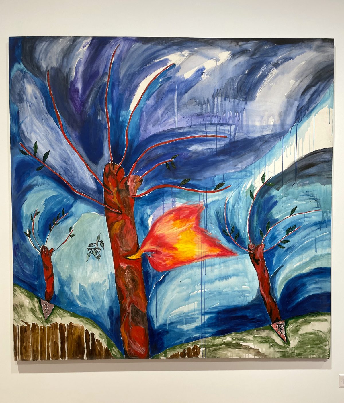 “Lara’s sinuous trees, in sync with a mosaic of blue and indigo brushstrokes, are not overtaken by the elements but rather move with them; their roots and branches seemingly shape the world around them through sheer psychical force.” —NH