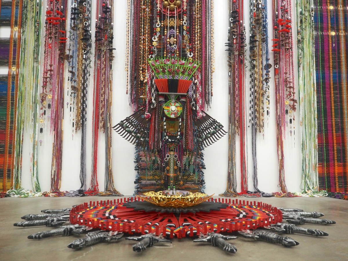 Malaysian artist Anne Samat’s grand installations resemble traditional woven, brightly colored altars but a closer look reveals toy soldiers, rake heads, and plastic keychains.