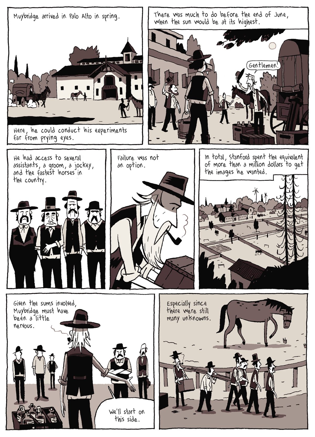 At several important moments in this comic book, like the murder or Muybridge’s death, Delisle invokes “slow motion” by imitating the style of the motion studies, breaking down the action into a series of images with minute differences. Arranging the panels alongside each other on the page — their respective images happening both sequentially and simultaneously — encourages the reader to consider each element of a scene, highlighting in particular the different ways that comics and cinema organize time.