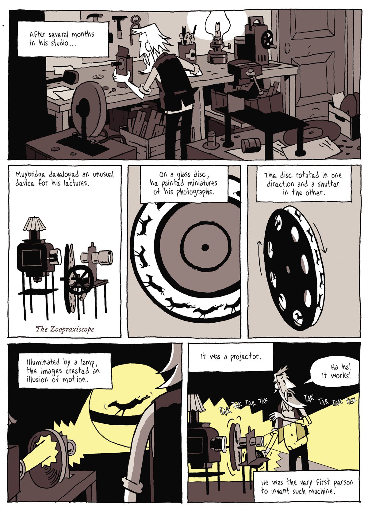 Strewn along the path to the invention of motion pictures are numerous transitional fossils. Humans experimented with different ways to capture images and manipulate the persistence of vision for millennia before these techniques melded, culminating with the Lumière brothers being falsely accused of terrifying a Lyon crowd with footage of a train. Though the new graphic novel Muybridge is primarily a biography of Gilded Age chronophotographer Eadweard Muybridge (who actually intentionally chose that name), author Guy Delisle makes space for many other shepherds of primordial cinema.