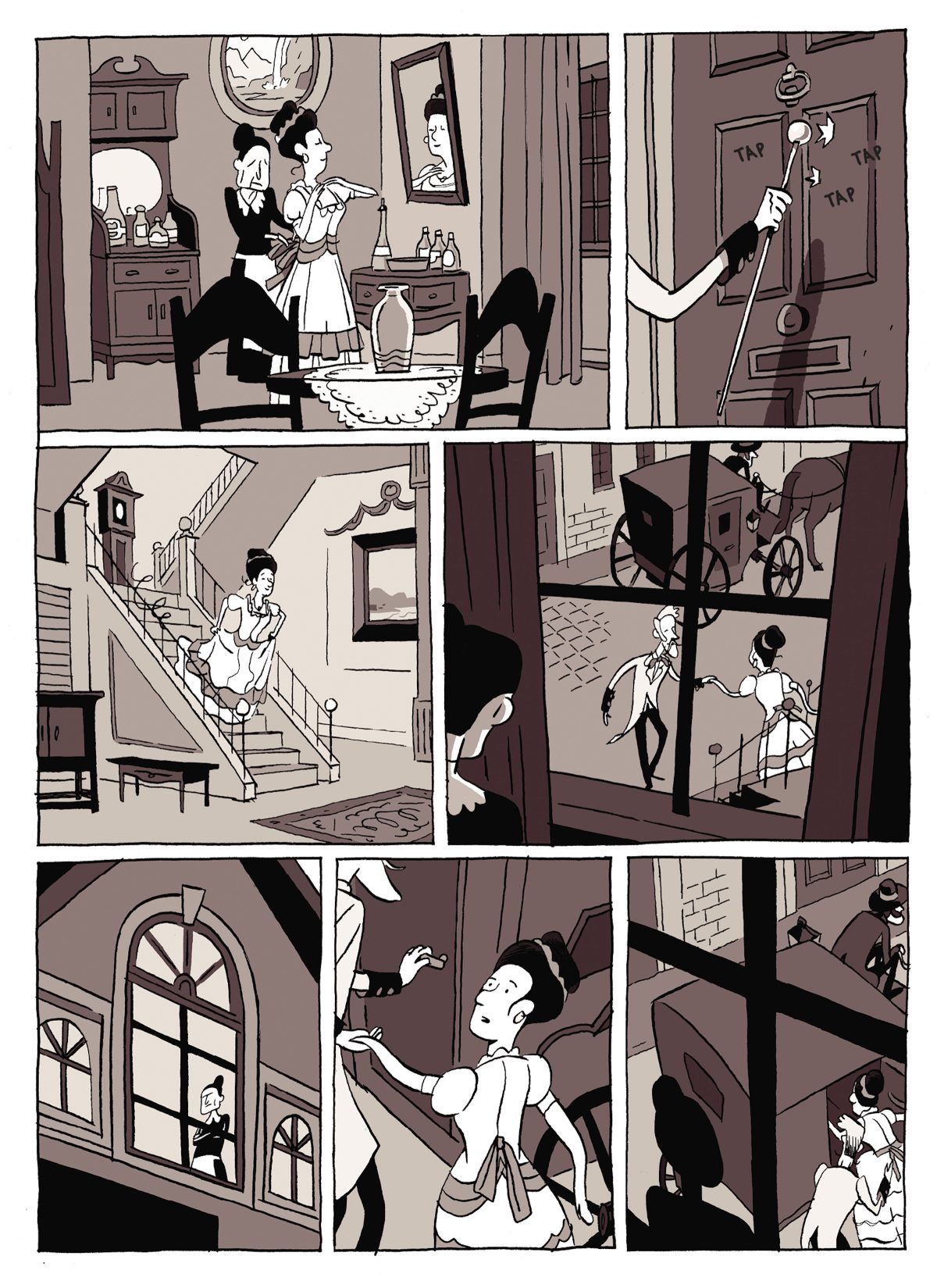 As the above might suggest, Muybridge is as much a social history of photography and its relationship to culture during the 19th century as it is one man’s life story. With cameos from the likes of Charles Baudelaire, Delisle explains how the ability to replicate life in prints affected everything from the art world, as some painters saw their craft threatened, to commercial interests, as the demand for photographs increased. Muybridge entered the business in this context in 1850s California, becoming well-known for documenting “frontier” regions like the West and Alaska, satisfying a market hunger for photography’s perceived capacity to deliver the reality of far-flung places. Delisle’s cartoony style, however, removes any pretension of realism. It is occasionally interrupted by reprints of photos or motion studies, marking a stark divide between “everyday” life as rendered by the pen and life as rendered by the camera.