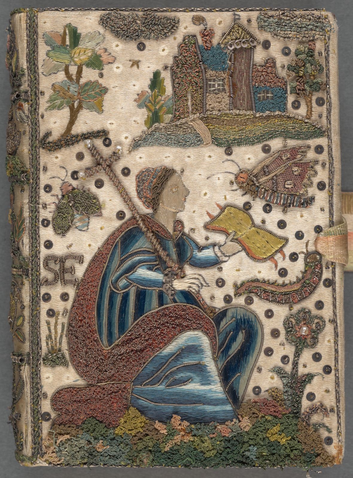 It is a joy to discover the interconnected thematic threads amongst the artworks in the exhibition, which line the third-floor hallway-gallery of the Rayner Special Collections Wing. On one end of the periwinkle-painted hall, a tidy assortment of historical pieces in a largely sepia palette showcases early examples of the blending of printing and textile arts, such as embroidered books and etchings with appliquéd silk.